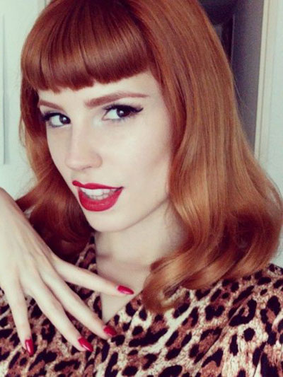 Svetal ten, jaka tamna ili vatrena boja kose i haljina u tom stilu. Prava ste diva retro izgleda. Ovo je veoma lako za kopirati. Ispeglane šiške a kosa uvijena na staromodne viklere. I eto, prava ste diva prošlog veka! Retro se sada itekako poštuje u svetu mode.
